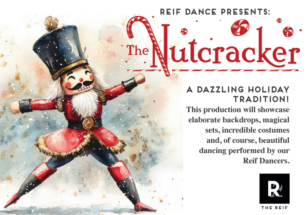 Recreated from the classical ballet by Tchaikovsky, and performed by the superb Reif Dancers, The Nutcracker tells the enchanting story of young Clara who dreams that her nutcracker doll is transformed into a valiant prince. After defeating the evil Mouse King and his army, they are transported to the fantastical Land of Sweets where they are welcomed by a host of delectable characters. A Reif holiday tradition like no other!