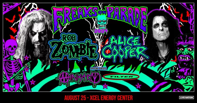 Rob Zombie and Alice Cooper take on the Xcel Energy Center on August 25th! With them they bring special guests Ministry and Filter.