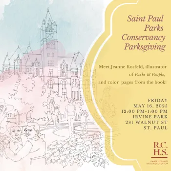 This summer, celebrate Saint Paul’s incredible parks by exploring 20 parks at your own pace! The newly published Parks & People historical coloring book highlights the walk’s 20 featured parks. Kick off your adventure at Irvine Park for Parksgiving, as we dedicate the newly restored Victorian Fountain. The RCHS booth will host Parks & People coloring book illustrator Jeanne Kosfeld, who will be available to sign copies, and provide coloring pages from the book.
