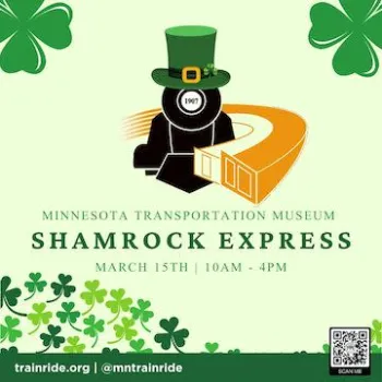 All Aboard the Shamrock Express at the Minnesota Transportation Museum! Take a themed ride on the Shamrock Express, explore our interactive museum exhibits, and enjoy a day packed with excitement. Admission includes access to all activities! (Food and beer available for purchase) Tickets available at https://www.trainride.org/theshamrockexpress/ or at the ticket window. All tickets are valid all day from 10:00 AM - 4:00 PM. Train rides are available throughout the day!