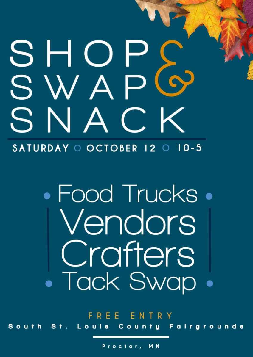 Join us October 12, 2024 from 10-5 for the first annual, "Shop, Swap & Snack" at the Proctor Fairgrounds in Proctor MN. This all new event features 100+ local makers and vendors to help you get a leg up on that Christmas list, over a dozen food trucks featuring some of the northlands best mobile food options, and a tack swap to help cowboys and cowgirls find new homes for some of their tack. Take advantage of the free parking by getting there early and making a whole day of it!