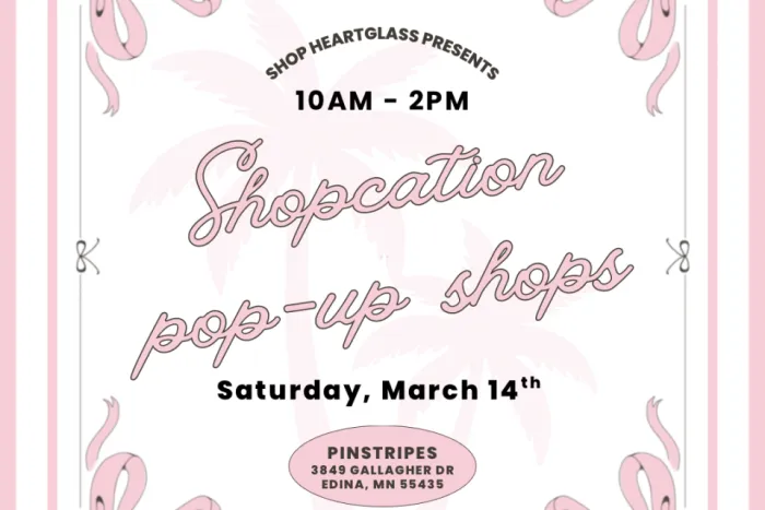 FORGET a STAYCATION... join us for a SHOPCATION and shop spring pop-up shops in Edina, Minnesota! Enjoy shopping, staycation vibes, and spring break prep with permanent jewelry, candles, swimwear, resortwear, aromatherapy soaps, coffee, and apparel! Featuring 15 of the best pop-up shops in the metro at Pinstripes in Edina, Minnesota! Either celebrating a STAYCATION or PREPPING for a VACATION, come SHOPCATION with us!
