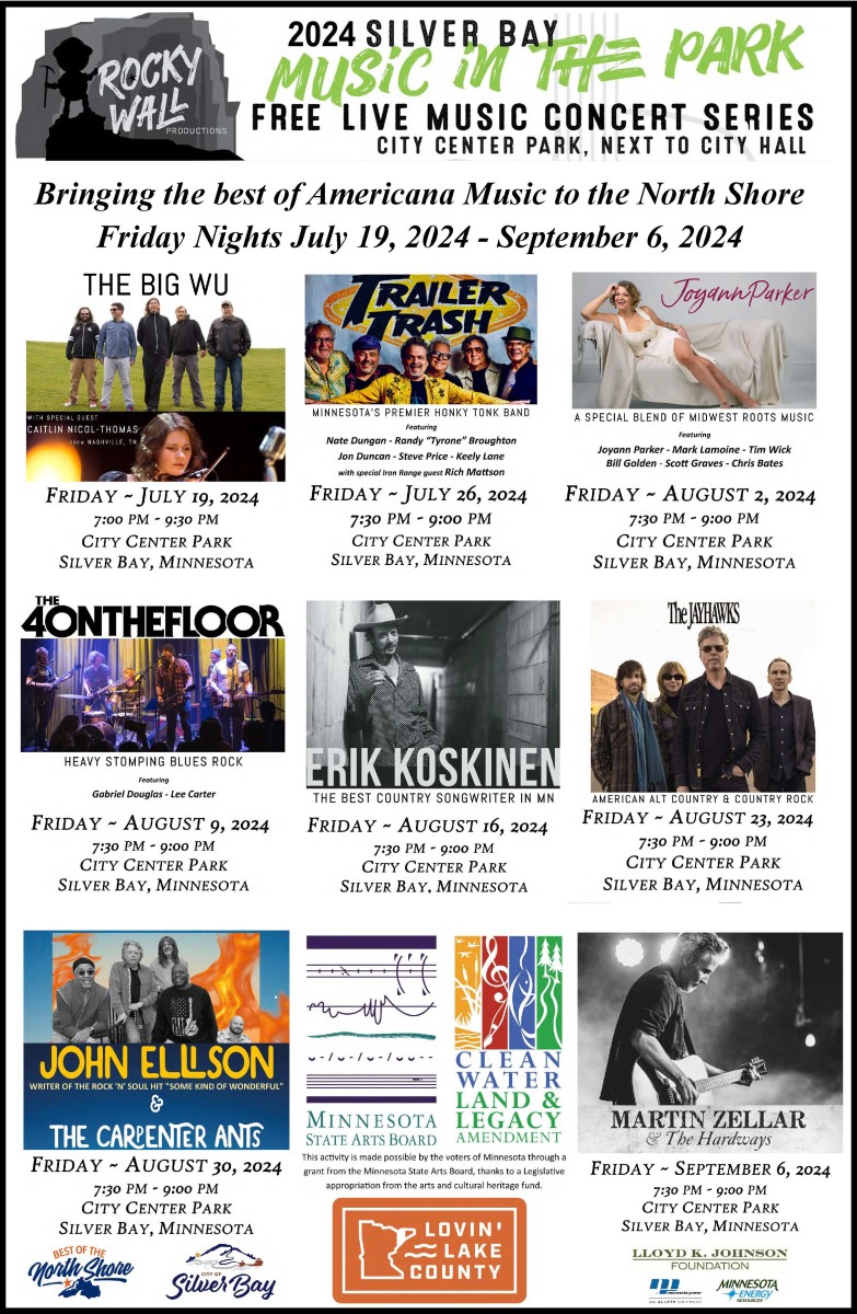 Rocky Wall Productions presents eight late summer FREE Friday night concerts for your enjoyment. We have booked some of the best in the business as we bring the best of Americana Music to the North Shore. Join us in welcoming these artists to the City Center Stage overlooking Lake Superior. We encourage you to bring a chair and/or blanket. Plan to arrive early as there will be food trucks and local restaurants available to provide you with dinner or snacks. See website for details.