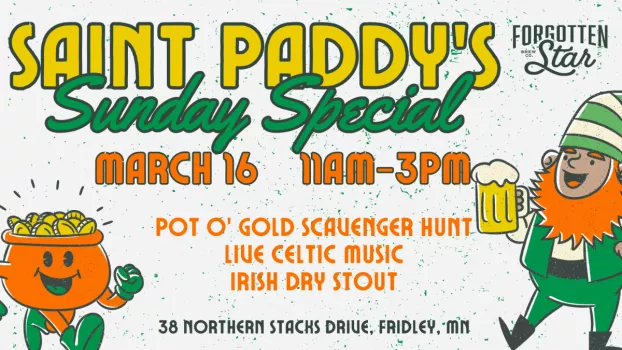 Roll out the green and get ready for a Saint Paddy's Sunday Special at Forgotten Star Brewing on March 16! Don't have green? No problem! We've got you covered with a new exclusive green Forgotten Star T-shirt (enjoy a free pint of our Irish Dry Stout when you buy this new T)!