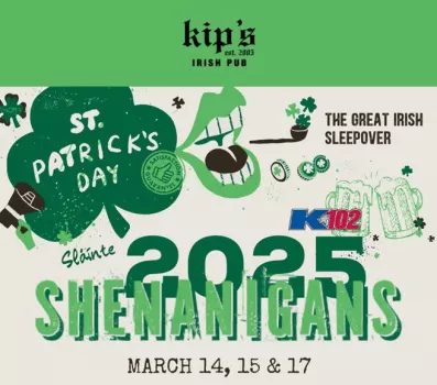 Join Kip’s Irish Pub for a 3-day St. Patrick’s Celebration! On Friday, March 14, the shenanigans start at 4 pm with K102’s Chris Carr & Company broadcasting live from Kip’s Pub. Kick things off with $3 Green Beer (12 oz) from 3-7 pm.