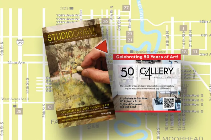 Gather your friends and family and tour the studios of Fargo-Moorhead’s arts community during the FM Visual Artists’ free Studio Crawl—October 4 and 5, 2025, noon to 6 p.m. Established artists, group studios, and student artists will open their doors to you and demonstrate their work.