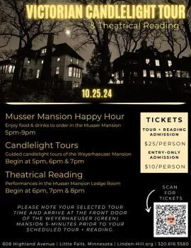 The Linden Hill Historic Estate will be open with Happy Hour in the Musser (white) Mansion from 5pm-9pm with food and beverages available to order in the Parlor. Guests can mingle around the main floor and outdoor spaces throughout the evening with Candlelight Tours of the Weyerhaeuser (green) Mansion beginning at 5pm, 6pm and 7pm. Theatrical Readings inspired by Edgar Allen Poe will be performed by a costumed actor in the Lodge Room of the Musser Mansion at 6pm, 7pm, and 8pm upon the completion of each Candlelight Tour.
