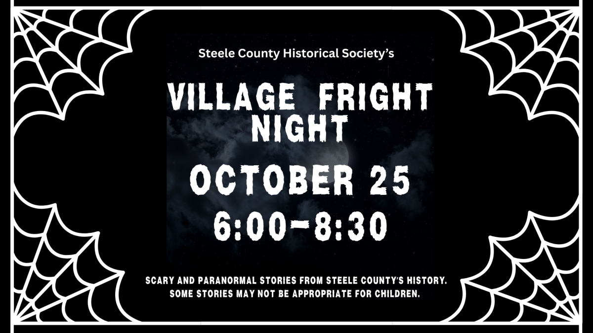SCHS invites you to experience the darker side of the Village of Yesteryear. On Saturday, October 25 from 6:00 to 8:30 pm, guests are encouraged to bring a flashlight as they stroll the grounds and tour the hauntingly beautiful buildings. Actors will be sharing scary and paranormal stories from Steele County and Southern Minnesota's history. Parent discretion is advised as some stories may not be suitable for young children. New this year, a Creepy Doll Scavenger Hunt and Vintage soda will be available to purchase. Cost is $2 per bottle at the Beaver Lake Pop Stand. No candy will be distributed at this event. This event is free and open to the public.