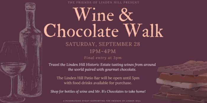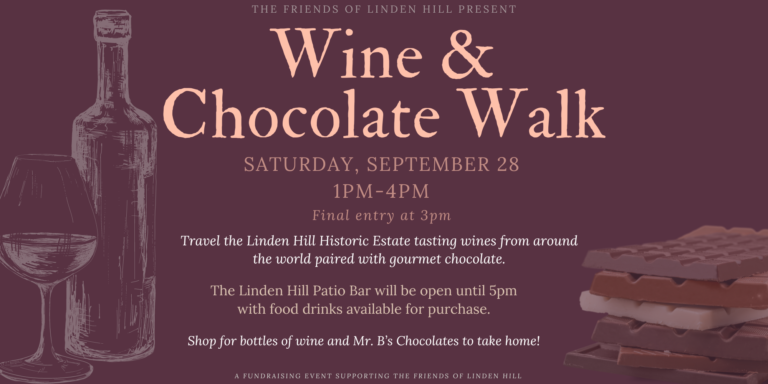 Tasting tickets are $40/person and Admission Only tickets are $10/person. Tasting tickets must be purchased in advance and are available online or through the Linden Hill office. Admission only tickets will be available in advance or at the door for those who want to join for the event but do not wish to taste the wine and chocolate.