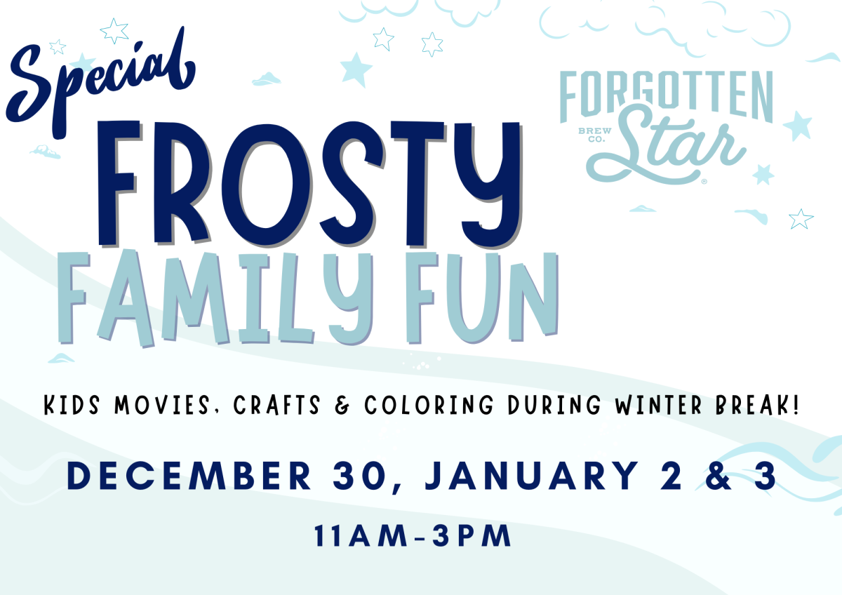 Looking for something to do with the kids during winter break? Join us during select dates and times for crafts, coloring and kids movies at Forgotten Star Brewing.Activities will be happening from 11AM-3PM on December 30, January 2 and January 3. Cheers!