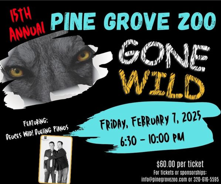 Pine Grove Zoo is already gearing up for their 15th annual Zoo Gone Wild! It's sure to be an unforgettable night filled with music, singing, and a lot of laughter. Be sure you get your tickets now before this event sells out! Tickets are $60 per person and can be purchased by emailing [email protected] or by calling 320-616-5595.