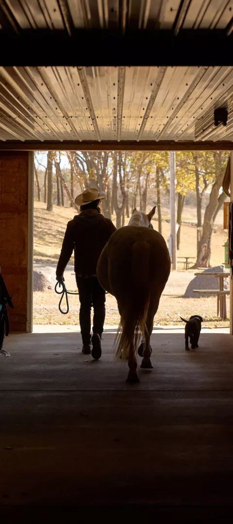 A horseback rider heads out into the midday sun at Carver River Valley Ranch