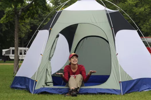 Five 12’x16’ cabins, each featuring a screened-in porch and furnished with a table, benches and wooden bunk beds with mattresses. Equipped with electricity, heat, overhead lighting, ceiling fans and outlets. Located near a modern restroom facility that includes showers, changing rooms and dishwashing sinks. A drinking fountain and water spigot are located near the restroom facility.
