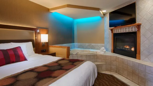 All rooms feature granite countertops, microwave, refrigerator, coffee maker, hair dryer, iron and Ironing board, HBO and free Internet access, most feature a private balcony. Renewal Steam Suites feature spacious steam shower w/5 heads, whirlpool spa, gas fireplace, regional artwork and cozy bathrobes. Superior Luxury Suite with corner two person whirlpool, fireplace, cozy bathrobes, teak balcony furniture, wet bar... Grand Rooms include flat panel TV, Spa Shower with 2 adjustable body sprays and make-up mirror. Corner Fireplace Rooms feature a panoramic lake view.