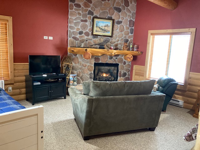 Bluff Country Retreat has a Bunk House available for larger groups who rent the house and want more space, couples, couples with up to 2 children, or other groups of up to 4 guests. The Bunk House has a log framed queen bed, a twin bed, and a pullout couch with a twin mattress, a kitchenette, bath / shower, TV / Blue Ray, A/C, a gas fireplace (winter only), fire ring (wood provided), a charcoal grill, and a washer / dryer (please let us know if you plan to use). The Kitchenette has granite counters, a full sized fridge with ice maker, a microwave, electric hot plates, electric griddle, coffee maker, a Keurig, and is fully stocked with dishes and other amenities to make meals.