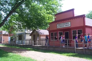 Twenty-four buildings, village includes shops, bank, church, authentic log cabins, school; wooden…