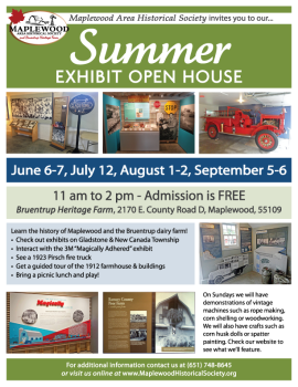 Open house from 11am-2pm on second Sunday and Monday in July, August, September and October. Free admission. Exhibits open during events as listed on our website: www.MaplewoodHistoricalSociety.org.