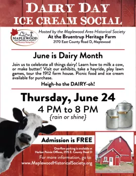 A museum of dairy farming in Ramsey County from 1945 - 60 including exhibits and video on milking, display of farm equipment and tours of 1905 barn and 1912 house. Exhibits of early Maplewood history including Gladstone, 3M and a display of Gladstone fire department including a 1923 Pirsch fire engine.