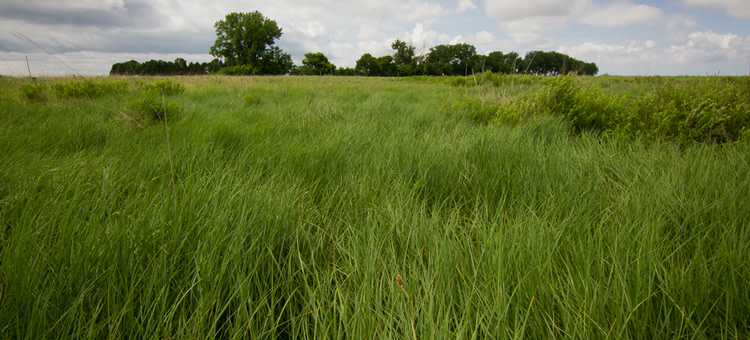 Dominated by native grasses and sedges-side-oats grama, slough sedge, Indian grass, porcupine grass-it's no surprise that this is a haven for grassland birds. Species include the upland sandpiper, the endangered chestnut-collared longspur, dickcissels, and horned larks. Hear the "bubbling, jangling, rising warble" of the male bobolink in spring and early summer, its dun-colored mate somewhere nearby on her ground nest. Find orb spiders by the dew shining on their webs anchored among the grasses, and keep an eye out for the rare poweshiek skipper. Shallow wetlands provide migrating northern shovelers, northern pintail ducks, and other waterfowl with opportunity to rest and refuel on abundant invertebrates.
