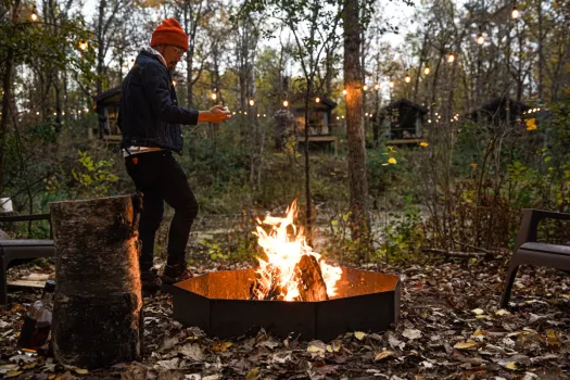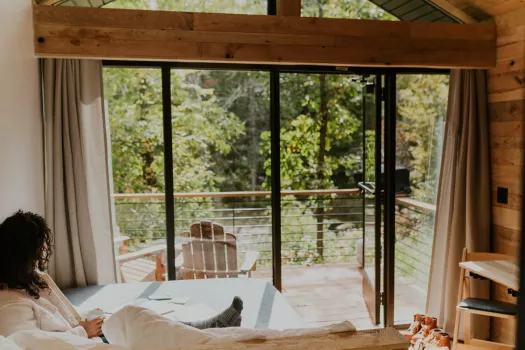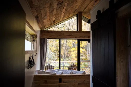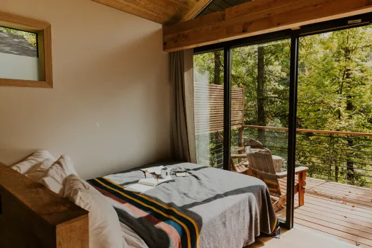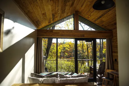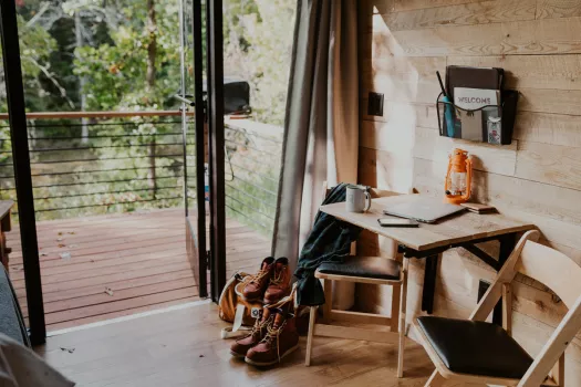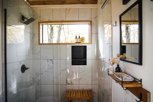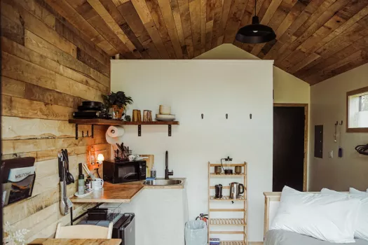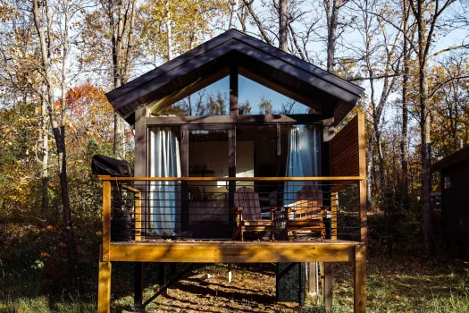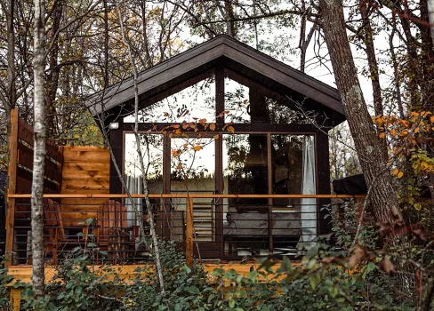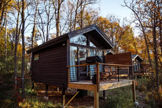 We've built 5 modern, tiny cabins on stilts in the woods with safari tents coming Spring 2021. Our cabins provide all the comforts of home while being nestled in nature. Your queen bed faces directly out to woods with floor to ceiling glass. Each cabin has it's own bathroom, kitchenette, grill, and much more. Tents will have access to the shared bathroom/shower house.
