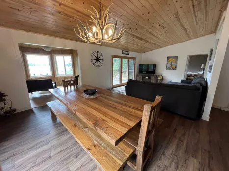 Dining room has a beautiful harvest table with chairs and benches for gathering. A walk-out patio door to the deck. The cabin has central heating and air conditioning, 2 separate decks overlooking the lake with lounge chairs, table and chairs, a charcoal grill (bring your own charcoal), high-speed fiber optic internet for WiFi, and a smart tv for your digital fix!!