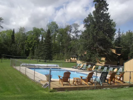 All cabins include reserved dock spaces with electricity, private deck or screen porch, fully equipped kitchen, bath, satellite TV, internet, and a fireplace. Resort amenities include a heated swimming pool, sauna, fire pit, water toys, and a game room nestled in the woods. There are paved roads to the resort and a paved boat launch, as well as fully rigged fishing boat and pontoon rentals, guide services, gas, bait, and ice for sale onsite.