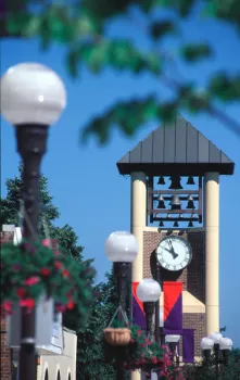 The Glockenspiel is one of the world's few free-standing carillon clock towers, standing 45 feet high. Thirty-seven bells chime each quarter hour and play programmed pieces at 12, 3 & 5pm when the three-foot-high animated figurines appear and move to music as they depict the history and development of the city. From Thanksgiving until mid- January, the figures are replaced by a nativity scene. The surrounding park has benches and apple blossom shade trees.