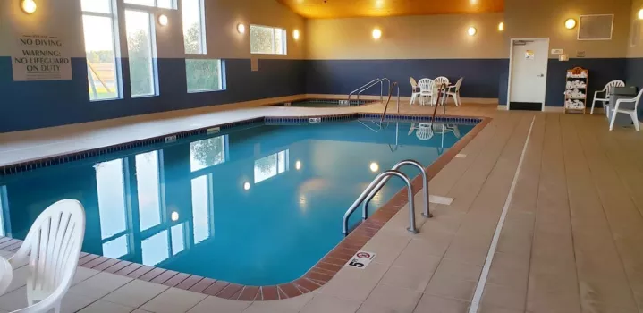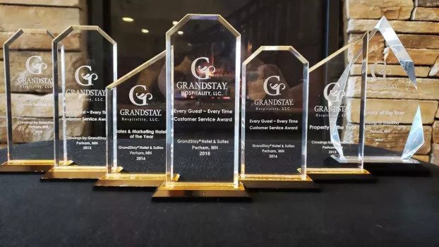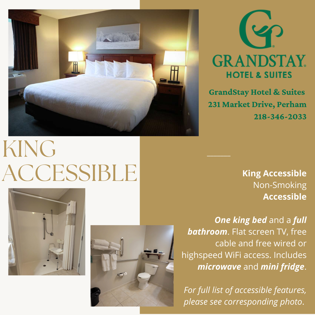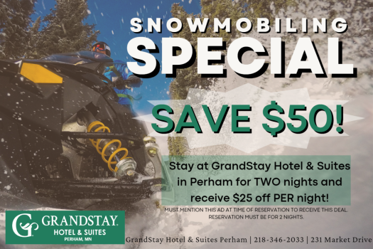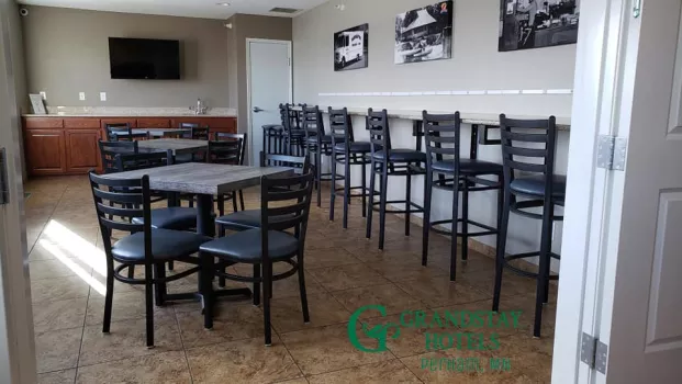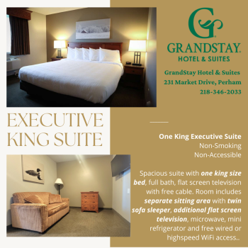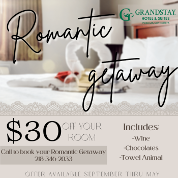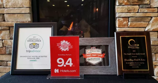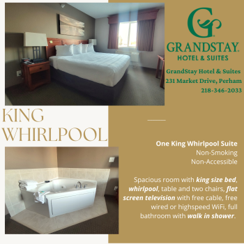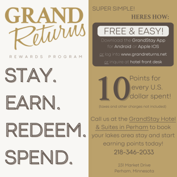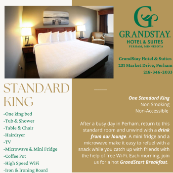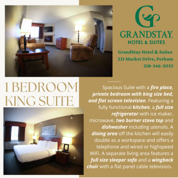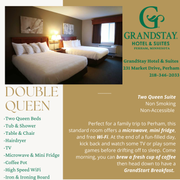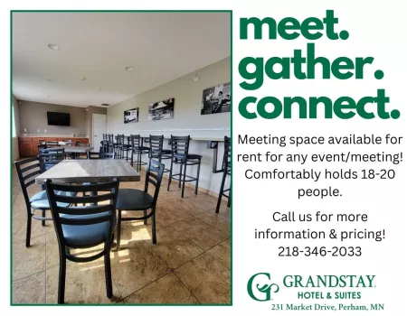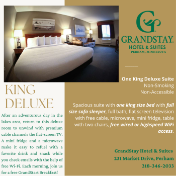 Perham's newest hotel! 45 guest suites with microwaves and mini fridges. We have extended stay suites with fireplaces. Complimentary Hot Breakfast. Free Wifi and wired internet access. Indoor pool with Hot Tub. Patio with Gas Grill & firepit. Kids can enjoy the Rainbow Playground. Onsite meeting room available to seat 25-30 people. Enjoy our on-site Moonlight Lounge at the GrandStay in the evenings!