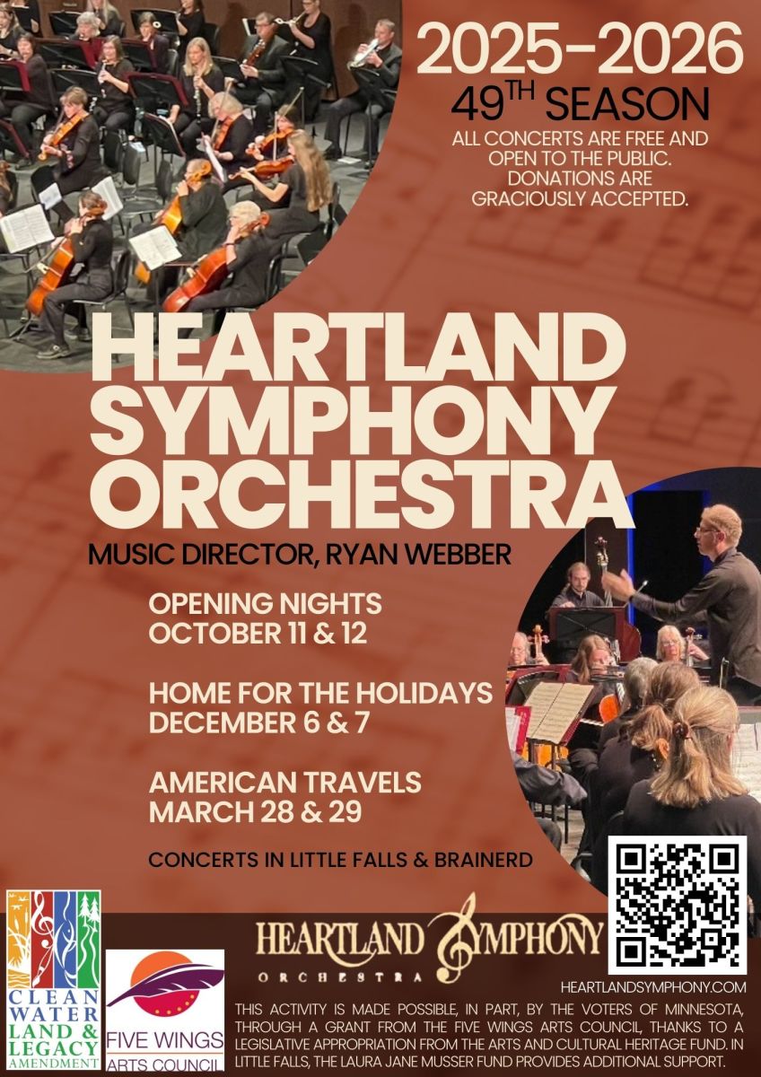 Fifty piece community symphony orchestra presenting a series of concerts in Brainerd and Little Falls three times annually (October, December and April).