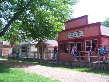 Twenty-four buildings, village includes shops, bank, church, authentic log cabins, school; wooden boardwalks surrounding village square, bandstand. Situated on 20 acres, this historic village is a sure hit for all ages. Come take a step back in time with us!
