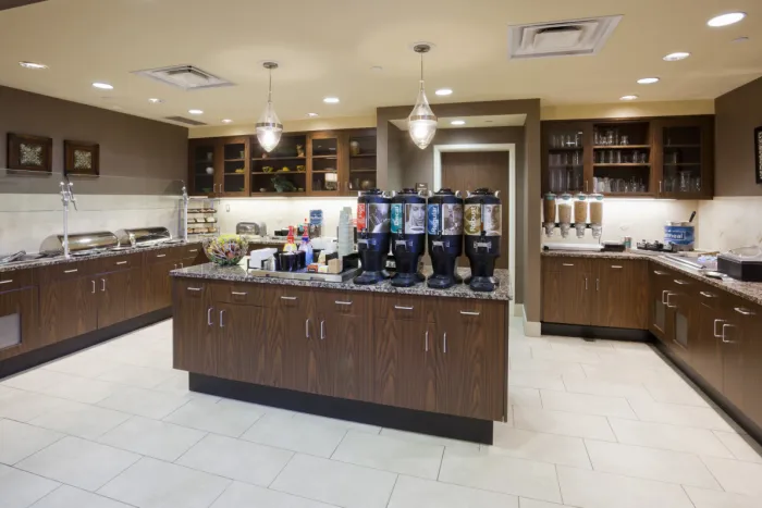 Our spacious studio, one- and/or two-bedroom suites feature separate living and sleeping areas. Each has a fully-equipped kitchen with full-size refrigerator, microwave, two-burner stove, and dishwasher. You'll find the comforts of home including two remote control TVs and complimentary high-speed Internet access. Enjoy a complimentary hot breakfast seven days a week and a Welcome Home reception featuring a light meal and beverages Monday through Thursday evenings.