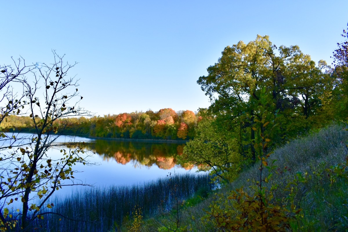 12.0 km track set. Mostly intermediate-level trails. Gently rolling glacial hills populated by oak, ash, maple, and basswood forest. The loop-style trail system winds around two small lakes. Trail maps are available at the visitor center which is a remodeled dairy barn. The building is heated and includes bathrooms and a small kitchen.