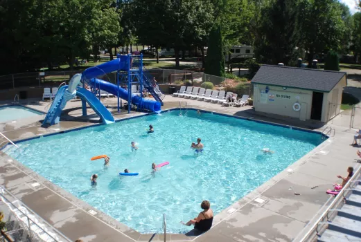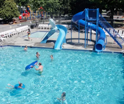 Exceptional Family Fun! THRILLING 48' POOL SLIDE! High quality facilities, clean restrooms & professional staff. Coordinated activities & theme weekends include family relays, toddler activities, treasure hunts, wagon rides, DJs, bingo, Kan Jam, Splash n’ Dash, Spikeball, bean bags, crafts, Lil’ Tykes Train rides, pools, scavenger hunts, horseshoe and volleyball tournaments, adult trike races, mini golf, contests & much more!