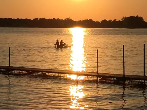 After a fun day of playing on the 75-foot sand beach, cruising around the lake, swimming off the dock and soaking up the sun, you can watch the sunset as you sit by the bonfire on the sand beach.