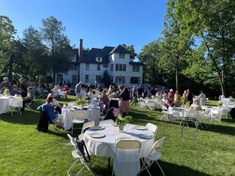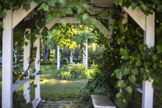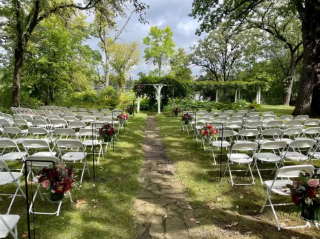 as linden trees for which the estate was named), and blooming flowers. The Musser home (white) is used as an event space but can also