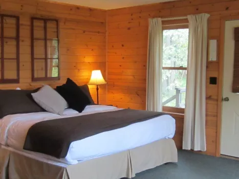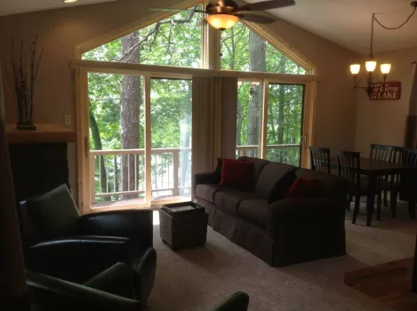 Our cabins feature wood-burning fireplaces, luxurious new beds and linens, air conditioning, and are surrounded by woods and water. Towels, bedding, toiletries, and firewood are provided for you. Our two private hiking trails surround Lost Lake and the on-site Indian Burial Grounds.