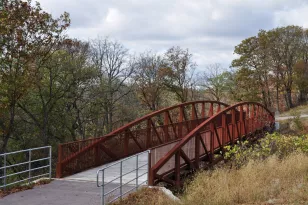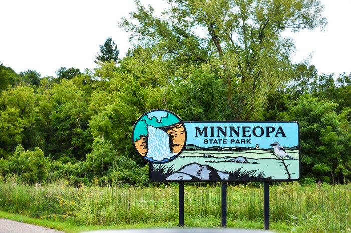 The name Minneopa is derived from the Dakota language, meaning "water falling twice," a reference to the park's stunning waterfalls along Minneopa Creek. Take a short, accessible walk along a paved sidewalk and cross the arched concrete footbridge that spans the creek between the upper and lower waterfalls. Just ahead, you'll be treated to a striking view of the falls, along with a panoramic view of the exposed geological layers shaped by the creek's gradual erosion of the landscape.