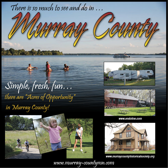 Located in Southwest Minnesota, Murray County is rich in natural resources, including water, wildlife, and prairie lands. There's so much to see and do: Lake Shetek State Park, 9 county parks, 3 historic museums, hunting, fishing, camping, golf, shopping, dining, history, prairie vistas, wind towers, yearly festivals and events.