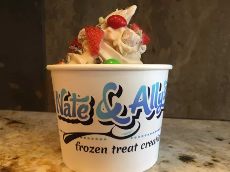 Hungry for a soft serve frozen treat or hard ice cream? Then Nate & Ally's is the place for you! You can have your treat in a cup, waffle cone, or waffle cup and then add your choice of toppings. Or, pick your frozen treat and toppings, put them in a tall cup, and get them mixed together with our Mix-It. There are a variety of other frozen treats such as ice cream sandwiches and sliced pie from the world famous Stockholm Pie Company in Stockholm, WI. You can take your treats with you or enjoy them in our relaxing atmosphere.