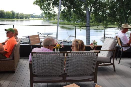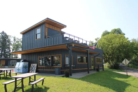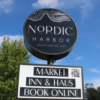 Our lakeside property includes 3 structures: The Nordic Harbor Haus is a 2 bedroom, plus bunk room, 2 bathroom, light filled, gorgeous vacation home. Sleeps up to 8. A serenely private backyard gives you northern Minnesota vibes. The colors in the fall are epic. The Nordic Harbor Inn is a 6 room boutique motel, outfit with 4 single rooms and 2 suites, which sleep up to 4 with the pull out sofa in the living room. Each room is unique! The rooftop at Nordic Harbor, located just steps away from the rooms, is a luxurious, modern, yet cozy bar that redefines bars in the area. With its ability to be enjoyed year round the panoramic windows and heated enclosure offers a cozy reprieve in the colder months. An an open windowless experience in the warmer months. The Nordic Market at Nordic Harbor—a one-stop shop for quality, convenience, and indulgence. From creamy, artisan gelato, burnt end brisket sausages and fresh groceries, everything you need is thoughtfully curated with a Scandinavian touch. Beer, wine, liquor, bait and ice for your coolers truly makes Nordic Harbor a one stop shop.