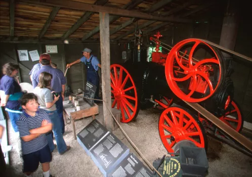 This historic area was recognized as a community treasure long before it became a state park. Visitors enjoy the old flour mill and log cabin as well as the clean swimming beach, spacious picnic grounds, campgrounds and 7 mi of woodland/prairie hiking. The sliding hill, 4 mi of groomed cross-country ski trails, and the 1.5 miles of snowmobile trails open up winter recreational opportunities. A warming shelter is available in the winter that serves as a picnic shelter in the summer.