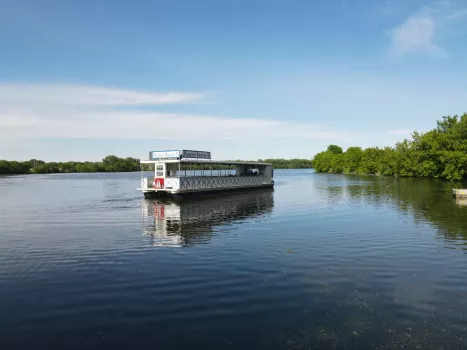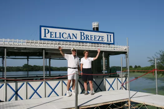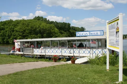The Pelican Breeze II Tour Boat, on Albert Lea Lake, is a 55-foot pontoon river-boat-styled vessel with a seating capacity of 55. It features 2 smoke stacks, a paddle wheel, and 11 tables.