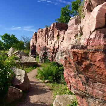 We invite you to connect with tradition at Pipestone National Monument and experience the tranquility of the quarries held sacred by Native Americans for thousands of years. Watch artisans who keep alive the art of hand-carving pipestone. Walk the scenic paved Circle Trail along the prairie and pink Sioux Quartzite ridgeline. Stand at the 1838 Nicollet Expedition marker where European explorers stopped while mapping the area. Behold the natural rugged beauty of Winnewissa Falls, Old Stone Face (Leaping Rock), and the Oracle. Earn your Junior Ranger Badge. Shop a variety of authentic Native American and pipestone crafts at the PNM Visitor’s Center as well as nearby gift shops including a replica 1860s fort and the Historic Rock Island Depot.