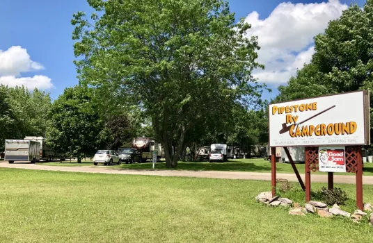15 acres of grassy flatland located in Minnesota's Tall Grass Prairie Region. Conveniently located across from the Pipestone National Monument, Pageant Grounds, & 7 blocks from historic downtown. Shaded grassy pull-through sites most with full hookups. Large tent camping sites. Game room, multi-level playground, and heated pool. Recreation hall available for family reunions and club rallies. Special weekly, monthly, seasonal rates.