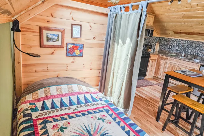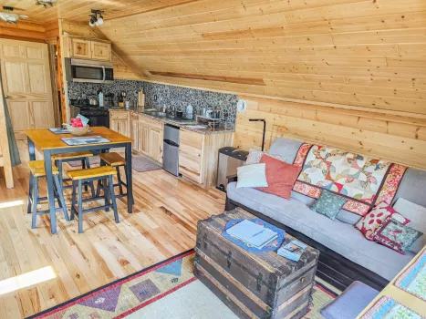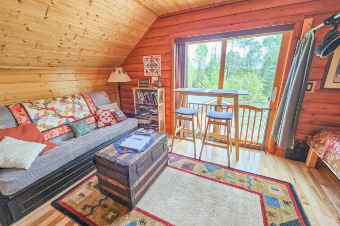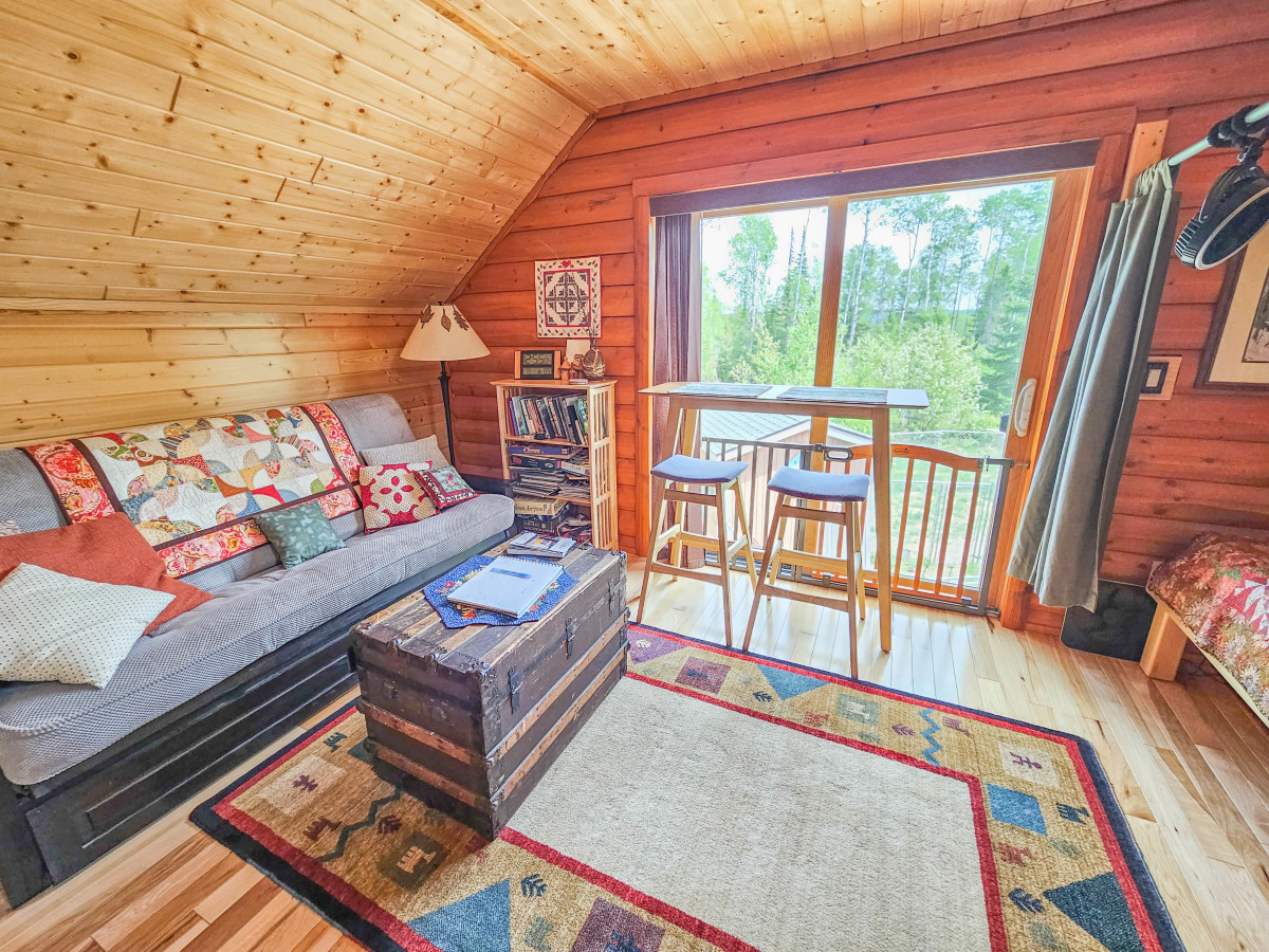 Not only one of the most unique lodging options you will find along Lake Superior's North Shore or near the Boundary Waters Canoe Area Wilderness and Superior Hiking Trail, but an absolutely one-of-a-kind experience! Our Guest Suite has rustic hickory floors and kitchen cabinetry, knotty pine ceilings, half log interior side walls and Lake Superior stone back splash. It doesn't get any more rustic north woods/north shore than this! This is a bright space filled with natural light from a large patio door window and three skylights.