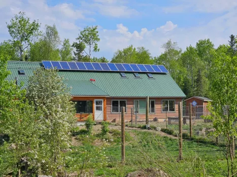 The Points Unknown Guest Suite is located within our off-grid homestead, in Minnesota’s remote north woods, 35 minutes northeast of Grand Marais. We are located 7 miles from the conventional grid. Our energy comes from 16 solar panels mounted on the roof of our homestead. We have 24 batteries in which this solar energy is stored. On cloudy days, we have a propane generator that produces the energy used and stored. Propane, having a by-product of water, lessens our carbon footprint. We ask that our guests help us conserve our energy wherever possible. UPDATE: Power was brought up to Points Unknown through a federal grant. We’re thankful to be able to continue to use our solar energy system, however.