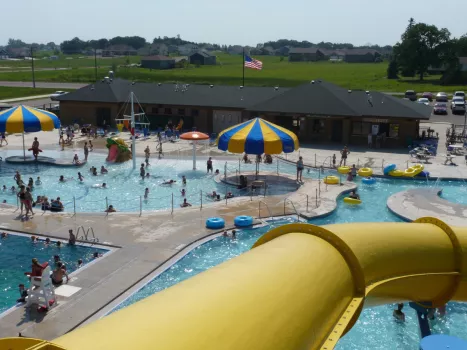 Owatonna's outdoor water park! Featuring 2 Water Slides, Lazy River, Zero-Depth entry with play features, Lily Pad Walk, Sand Volleyball Court, Activity Pool with Water Basketball, and a Climbing Wall!