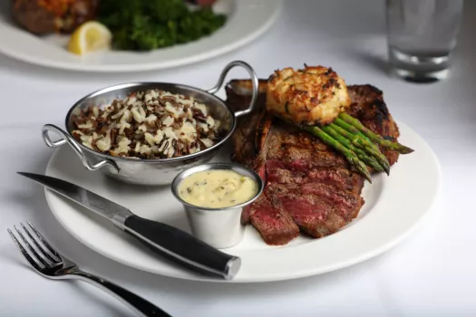 Our wood fired rotisserie is the key to our unique flavor. Hand-cut steaks start out as whole loin…