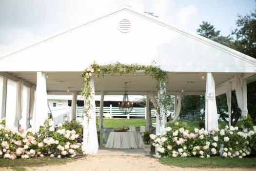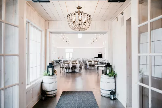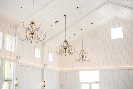 Enjoy the rustic but elegant tables and chairs, the white washed walls and ceilings, beautiful crystal chandeliers, and heat and air conditioning. We offer the perfect mix of natural beauty and comfortable accommodations. Willow Brooke Farm is committed to satisfying your wedding or event needs, and is honored to offer this barn venue as a nearby location for you.