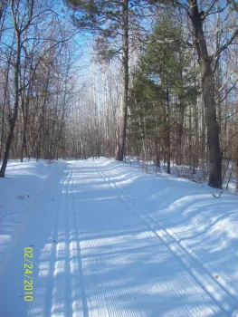 The trail system offers 10 kilometers of single track skiing with limited skating opportunity (1.5 k skating), hiking, biking, & horseback riding. The terrain is level to hilly with easy, moderate and difficult loops offering challenges to most skiers. The forest is a mixture of hardwoods and mature red and white pine(100+ years old). A shelter is along trail. Maps are at each intersection and trail head parking.